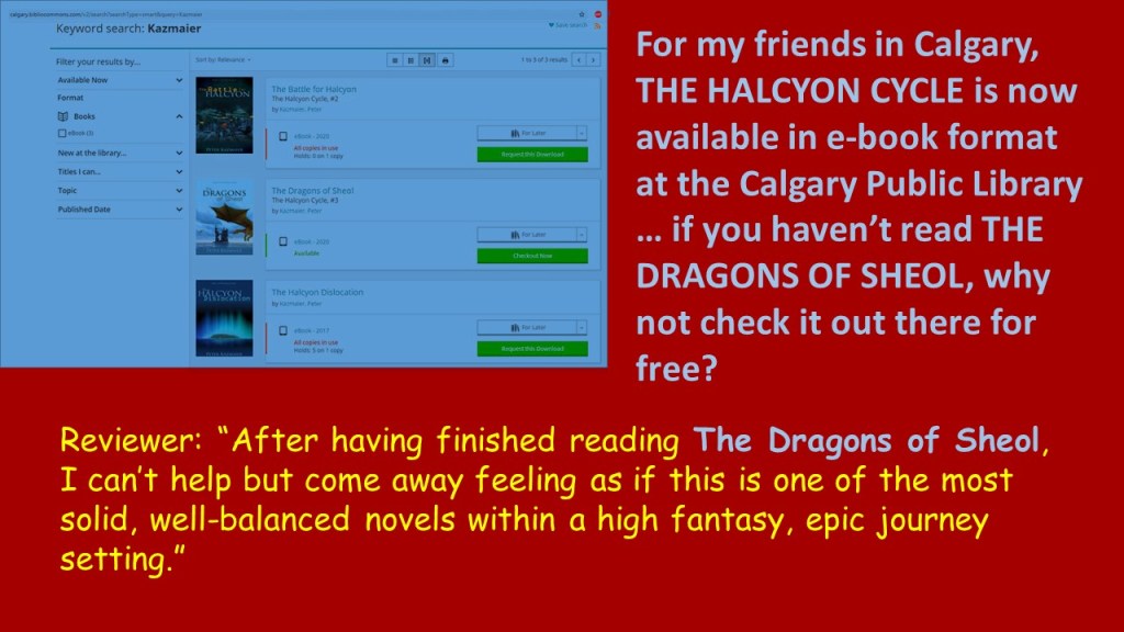 I am gratified to point out to my friends in Calgary, that THE HALCYON CYCLE books are now available in e-book format at the Calgary Public Library … if you haven’t read, for example, THE DRAGONS OF SHEOL, why not check it out there for free?
