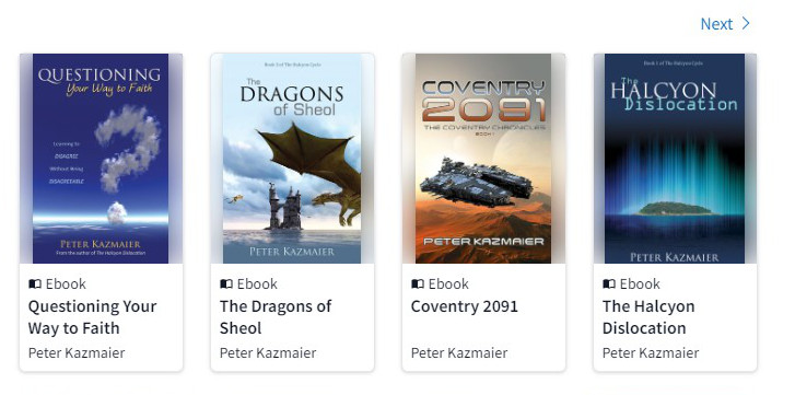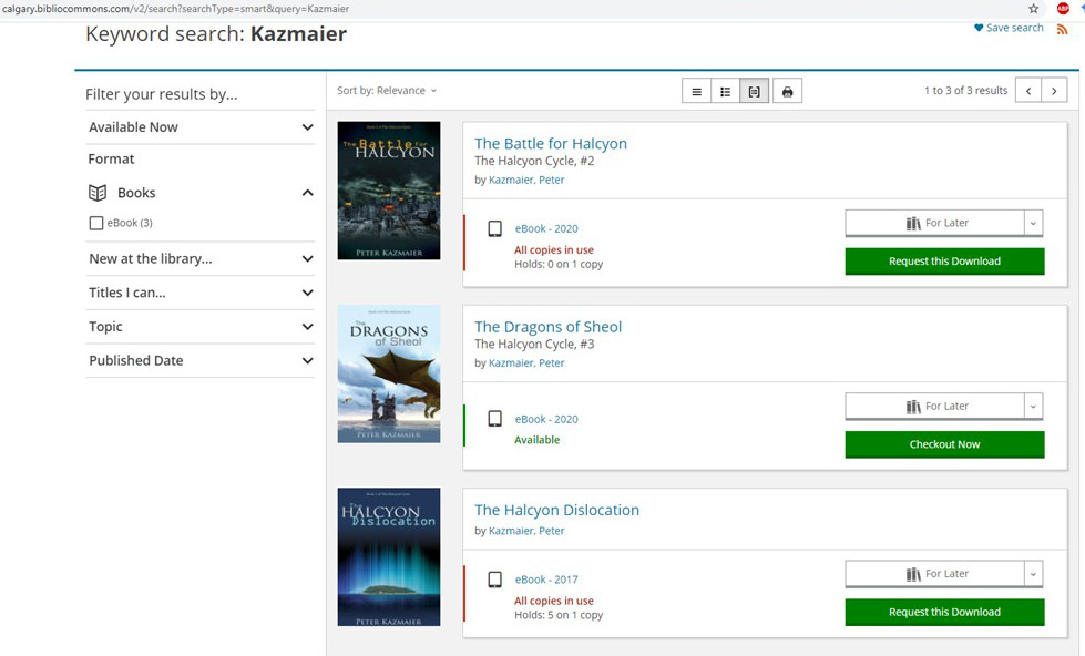 Hoopla is one of the largest library sites in North America. It has taken a while, but now four out of five of Peter Kazmaier’s books can be downloaded from Hoopla, and it is likely the fifth book, The Battle for Halcyon, will be available soon. Hoopla is a bit different than other library apps such as Overdrive’s Libby. In contrast to Libby where the library has to purchase e-books, before they can be lent, Hoopla makes the whole huge Hoopla library available to the library patron and a library is only charged if the e-book is borrowed.